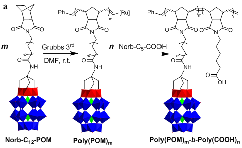 基于以上背景,南开大学王维教授课题组设计并成功合成了系列的聚(多金属氧簇降冰片烯)-(己酸降冰片烯)的杂化嵌段和无规共聚物,分别简写为Poly(POM)m-b-Poly(COOH)nPoly(POM)m-r-Poly(COOH)n在三代Grubbs催化剂催化,多金属氧簇降冰片烯单体己酸降冰片烯单体聚合成共聚物(1