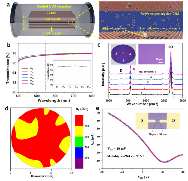 图3:静态常压CVD系统下制备石墨烯的光学和电学性质表征。(a)静态常压CVD体系批量制备石墨烯的原理图;(b)不同铜衬底叠层上石墨烯薄膜的透光率表征;(c)石墨烯的光学和拉曼表征;(d)石墨烯的方块电阻表征;(e)石墨烯的室温场效应迁移率表征。