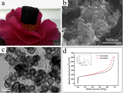 图2 石墨烯交联的碳空心球气凝胶:(a)花瓣上的气凝胶;(b)气凝胶的扫描电子显微镜照片;(c)气凝胶的透射电子显微镜照片;(d)气凝胶的氮气吸脱附曲线。