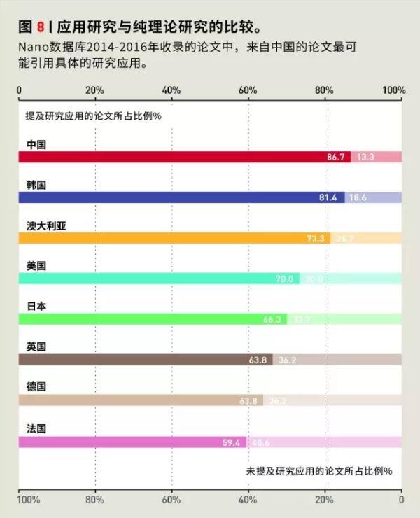 基于Nano数据库的分析也得到类似的结果。数据库所收录的论文中,中国有更多的论文明确提及论文所描述的纳米结构或材料的应用,其比例显著高于美国、德国、英国、日本和法国等多数科研强国(图 8)。只有韩国和澳大利亚与中国的情况相似。