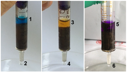 Fig. 4 Photographs showing the pressure assisted removal of MB (solution 1 and 2), MO (solution 3 and 4) and CV (solution 5 and 6).