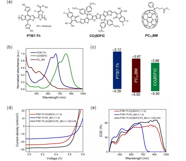 (a)PTB7-Th,COi8DFIC和PC71BM分子结构;(b)PTB7-Th,COi8DFIC和PC71BM膜吸收光谱;(c)能级图;(d)二元和三元电池J-V曲线;(e)二元和三元电池EQE曲线。