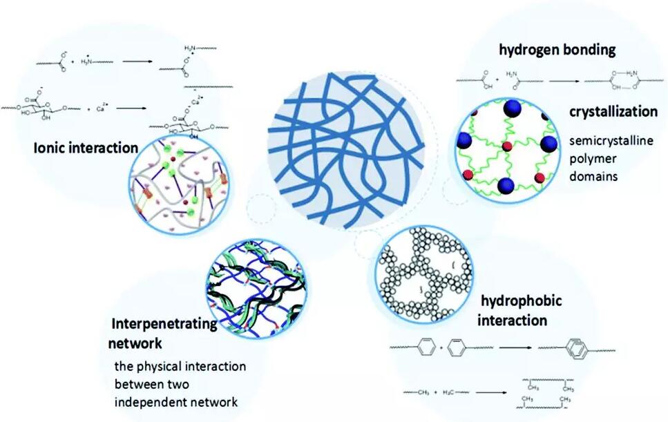 通过非共价成键作用形成水凝胶支架结构的机制示意图