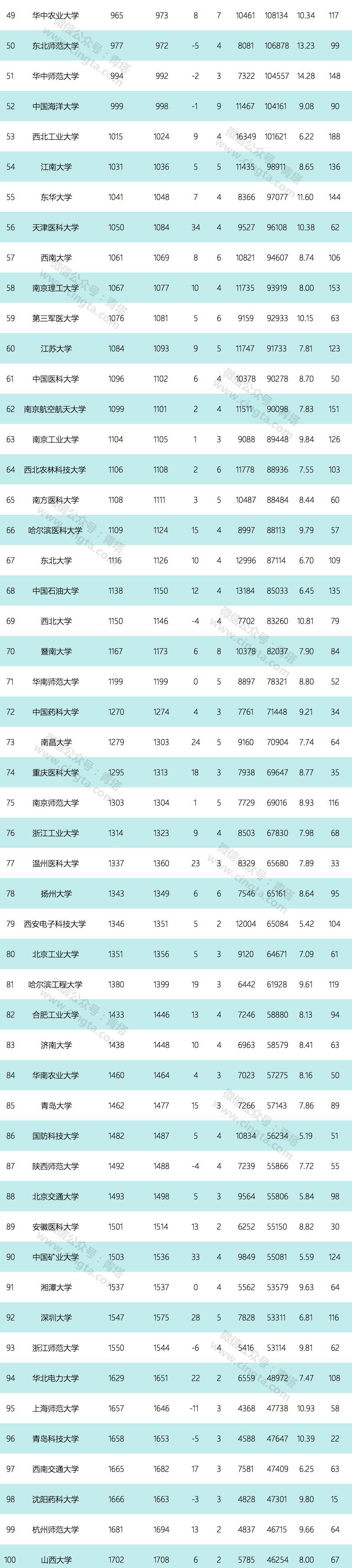从2018年1月ESI中国内地高校TOP100的数据统计数据来看,北京大学位居国内高校首位,国际排名107位,入选学科数也达到21个。中国科学院大学国际排名110位,入选ESI前1%学科总数为17个,位居国内高校第二。清华大学国际排名126位,入选ESI前1%学科总数16个,排名国内高校第三位。浙江大学国际排名128位,入选ESI前1%学科总数18个,排名第四。北京大学、中国科学院大学、清华大学、浙江大学、上海交通大学和复旦大学六所高校进入国际排名前200位。此外,南京大学、中国科学技术大学、中山大学和山东大学ESI综合排名也进入内地高校前十位。