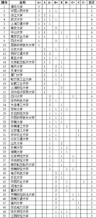 1. 选取在半数以上领域(4个)内具有学科获得A+~C-分档的高校进行排序