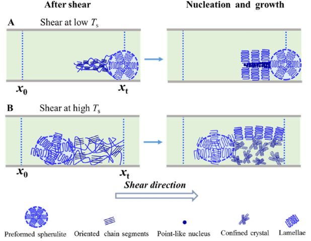 半结晶型聚合物在流动场下会发生从球晶到取向的“shish-kebab”,即串晶的转变,探索shish-kebab的形成机理一直是近年来研究的热点。 然而在实际加工过程中,聚合物制品最终的结晶形貌受多重因素的影响,比如注塑中熔体在略低于熔点的流动行为,流动的熔体在模具内壁的异相成核结晶行为等。这些因素导致了熔体内部和熔体-基底界面处复杂的应力环境,从而影响聚合物的流动场结晶行为。探究这些因素对流动场诱导结晶机理的揭示以及聚合物制品性能的提升具有重要意义。