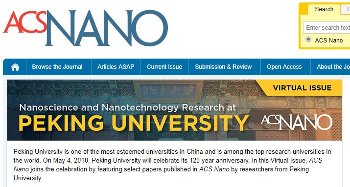 为庆祝北京大学百廿校庆,在国际纳米科技领域具有重要影响的权威学术期刊ACS Nano出版了“北京大学的纳米科技研究”虚拟专刊,并于北京时间5月3日上线。该虚拟专刊选编了来自北京大学的研究者们发表在ACS Nano上的40篇文章,从一个侧面反映了近年北京大学在纳米科学与技术研究方面的辉煌成就。