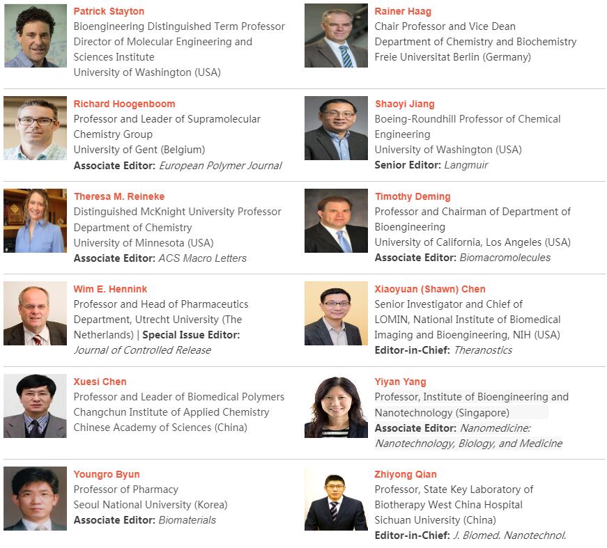 SIPCD 2018会议邀请了生物医用材料、药物控制释放、基因释放、纳米诊断、生物组织工程等领域的32名国内外著名教授和专家参会并做大会报告,其中包括10多个国际著名期刊如Journal of Controlled Release, Biomacromolecules, Biomaterials, ACS Nano, Chemistry of Materials, Theranostics, ACS Applied Materials & Interfaces, Polymer Chemistry, Materials Chemistry Frontiers, ACS Macro Letters, Langmuir, Nanomedicine: Nanotechnology, Biology, and Medicine, Biomaterials Science, ACS Biomaterials Science & Engineering, Journal of Materials Chemistry B, European Polymer Journal等的主编和副主编。会议将迎来国内外100多个单位的600多位参会代表,将接受350篇墙展报告。如前四届会议,SIPCD 2018会议将在国际著名期刊Journal of Controlled Release (一区,影响因子 7.786) 发表SIPCD 2018专辑。美国化学会期刊Biomacromolecules (影响因子 5.246) 将赞助和颁发8个最佳墙展报告奖(Biomacromolecules Poster Award),获奖者将赢得由美国化学会提供的奖励证书和300美元奖励。