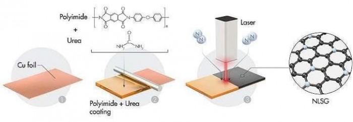 首先,KAUST的研究人员在铜箔上涂上一层由聚酰亚胺和尿素组成的聚合物,然后用强激光将其“碳化”进而使其变成石墨烯。另外,研究人员还在这个过程中使用了氮气。通过13%左右的氮气,最终研究团队得到了更具导电能力、原子间距扩大并能直接与铜基结合的3D石墨烯。