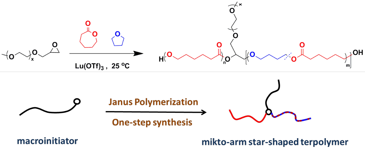 本工作从两仪聚合体系出发,以三氟甲磺酸镥为催化剂,四氢呋喃和己内酯为单体,将引发剂由环氧丙烷替换为单端环氧的PEG大分子引发剂,通过一步聚合直接获得三杂臂星形聚合物(PEG-star-PCL-star-P(CL-co-THF))。相比于其他杂臂星形聚合物的制备过程,两仪聚合这种新型的制备方法同时简化了聚合过程和提纯过程,为拓扑结构聚合物的制备提供了一条全新且简便的路径。