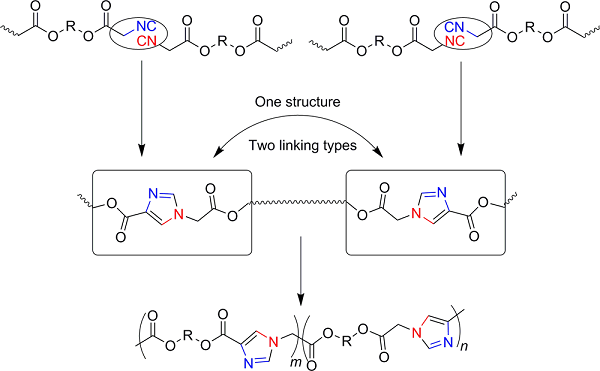本文设计和制备了5种具有不同结构的单体二异氰基乙酸酯,确定了这些单体的聚合反应的最佳反应条件,通过红外光谱、1H NMR谱图和13C NMR谱图对聚合产物的结构的表征,表明单体通过聚合反应成功制备了聚咪唑。本文还报道了聚咪唑的后功能化和在主链上引入TPE基元后的AIE性质。因此,本文报道的聚合反应有望应用于材料和生物等领域。
