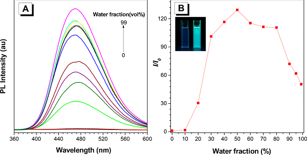 (A)聚合物PVI在不同水含量的DMF/水混合溶剂中的荧光光谱