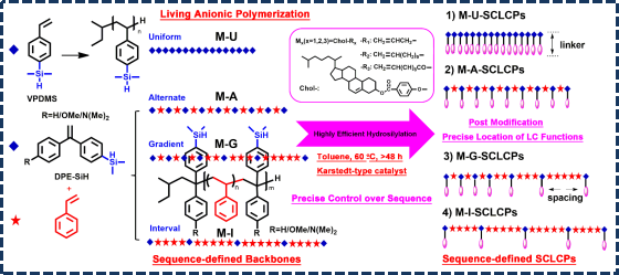 以上相关研究,拓展了序列结构聚合物的表征方法,也为后续序列可控功能性聚合物合成与性能研究奠定了基础。同时,序列可控聚合物能够从本质上揭示聚合物结构与性能的构-效关系,为高性能材料的设计和开发提供了科学依据。而液晶高分子材料中侧链型液晶聚合物(SCLCPs)结合了液晶和高分子的优良特性,其主链和液晶基元堆砌具有优异的分子协同效应,从分子水平设计和调控其性能具有重要意义。而当前液晶高分子合成其分子量、分布、拓扑结构等可控性差,很难明确解析结构与性能的“构-效”关系,迫切需要合成具有明确结构的SCLCPs,从本质上阐释结构对性能的影响机制。