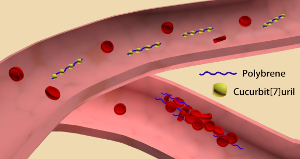 针对这一亟需解决的难题,澳门大学王瑞兵教授团队通过引入电中性的主体大环分子七元瓜环 (CB[7])利用其羰基端口对正电荷的中和作用来降低肝素中和剂如聚凝胺的表面的正电性从而达到无风险的凝血逆转作用。 瓜环分子在体外和体内小鼠模型评价中均表现出可减轻聚凝胺凝血的现象,更重要的是CB[7]表现出良好的生物相容性,不会引起额外的抗凝血副作用。