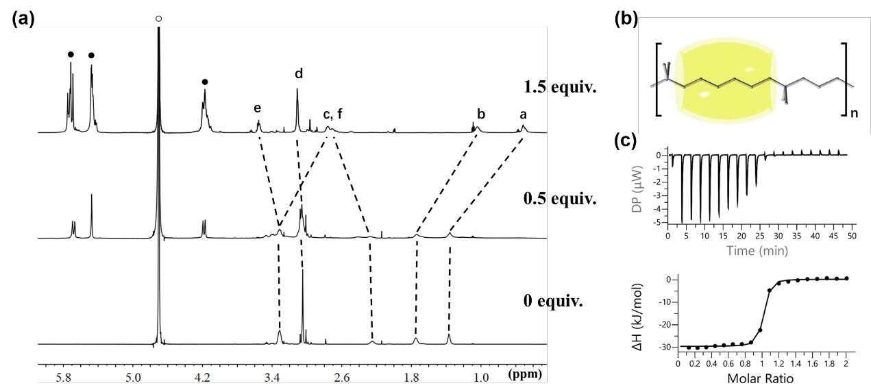 图2. (a) 0 mM的聚凝胺在用0, 0.5, 1.5当量的CB[7] 滴定时的1H NMR图。(b) HB@CB[7]形成准轮烷的示意图. (c) 等温滴定量热法热谱图(上),滴定过程中的焓变曲线图(下)。