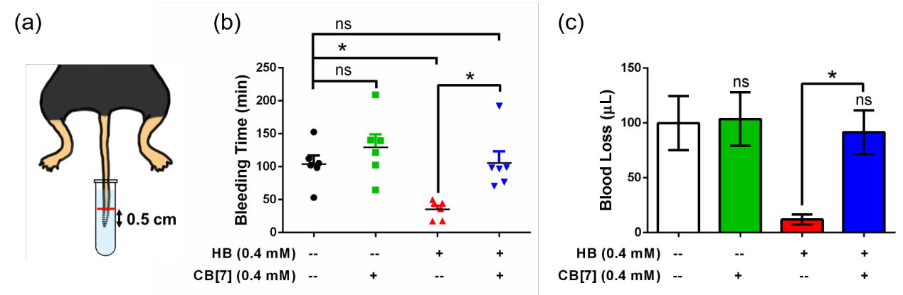 图3. (a) 小鼠割尾出血实验模型示意图。(b) 小鼠尾部的总流血时间。(c) 小鼠尾部流血的总流血体积。