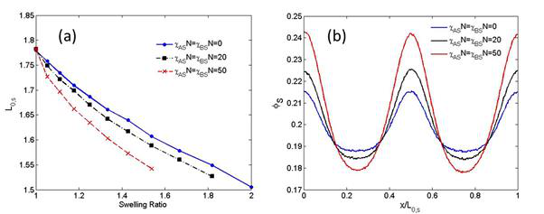 图1 嵌段共聚物在不同浓度溶剂中的溶解情况模拟结果,(a) 所得薄膜的特征尺寸与溶解率的关系;(b)嵌段共聚物中的溶剂浓度分布情况。