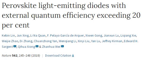 一篇来自南京工业大学的黄维院士和王建浦教授的合作成果,他们报道了一种外量子效率(EQE)超过20%的钙钛矿LED,能量转化效率高达12%。