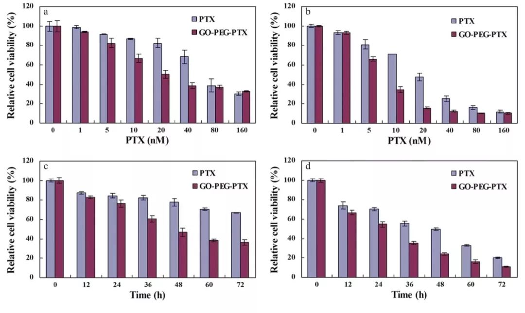 二维和三维聚合物分子刷的制备虽然有了明显进步,但由于其表面的化学“惰性”在无机球形和平面结构上高效可控地引入聚合物分子链仍是一项挑战。但是二维和三维聚合物分子刷由于结合了无机纳米结构基质的功能,如磁性,光学,电子和机械性能及聚合物的性质,包括刺激响应性、超疏水性和防污性等,因此,具有结构衍生性和协同效应的这类复合体系被认为是一类具有广泛应用前景的功能材料。在药物运输载体方面,该课题组制备了基于物理吸附的GO-PEG/PTX和基于共价键连接的GO-PEG-PTX,并研究了它们的细胞毒性(图4和5)。与游离的PTX相比,相同药物浓度下GO-PEG/PTX以及GO-PEG-PTX的细胞毒性更大。而载体GO-PEG对细胞基本没有毒性,载药体系的细胞毒性完全来自负载的PTX。