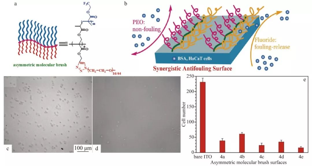 在防污应用上,该课题组首先通过一步法合成了一系列PA-g-PFMA/PEG的Janus型不对称聚合物分子刷,其具有独特的致密双刷状结构,具有non-fouling性质的PEG和具有fouling-release性质PFMA侧链密集分布在聚合物主链的重复单元上(图6)。通过抗细胞黏附实验证明对于双接枝共聚物表面,HaCaT细胞很难黏附,细胞倾向于聚集成簇。这是因为双接枝共聚物表面具有优异的抗生物污染能力,导致表面极度缺乏细胞的黏附作用点,细胞很难黏附。但是空白表面没有抗生物污染能力,表面存在大量黏附作用点,细胞很容易黏附、分散在表面。