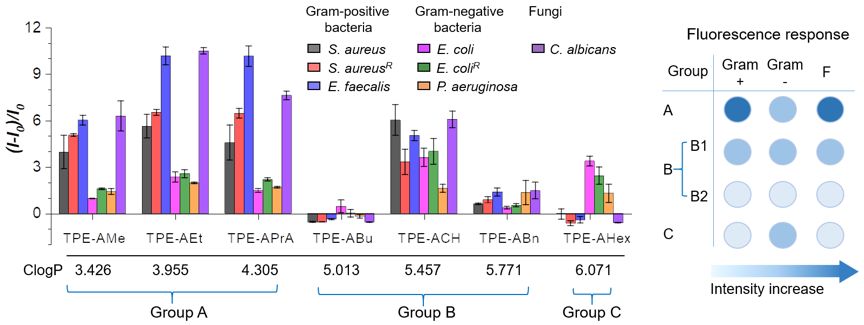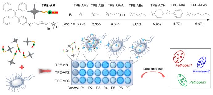 在此工作中,作者在四苯乙烯基上以烷氧基链为连接基团引入带有明显疏水性差异的季铵盐,得到一系列具有精确调节亲疏水性的AIE分子TPE-AR,其正辛醇/水分配系数(logP)从3.426 to 6.071,以此来调控AIE分子与病原菌间的多价相互作用,放大病原菌特征荧光响应的差异,实现对病原菌的准确鉴定(图一)。