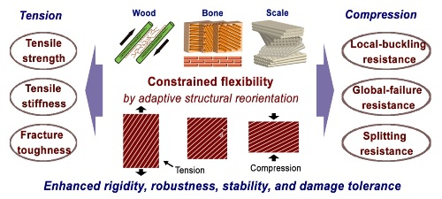 该研究组在系统阐明天然生物材料梯度设计的形式、原则及其起到的作用与机制的基础上,首次提出了新型材料组织结构取向梯度的概念与设计原则,建立了组织结构取向以及变形过程中发生的结构再取向与材料力学性能之间的系统定量关系,阐明了梯度结构取向与再取向对力学性能的优化机理,提炼了改善材料综合力学性能的仿生设计新思路,即通过控制微观组织结构取向实现材料的局域刚度、强度与韧性的优化分布与相互匹配,从而提高材料整体的力学性能。同时,该研究组首次发现,材料在加载过程中发生的组织结构再取向不仅可以提高其变形能力,更能够为实现综合力学性能的改善提供有效的途径,如图1所示。通过调整自身的组织结构与所受外力之间的取向关系,材料在拉伸条件下的刚度和强度逐步提高,同时裂纹扩展路径逐渐偏离最大正应力方向,因而断裂韧性得以同步增强;而在压缩条件下,材料的力学稳定性与劈裂韧性也表现出同步增大的趋势。因此,材料可以利用有限的变形实现其刚度、强度、稳定性与断裂韧性的全面提升,而这些性能本身则往往体现出相互制约的关系。