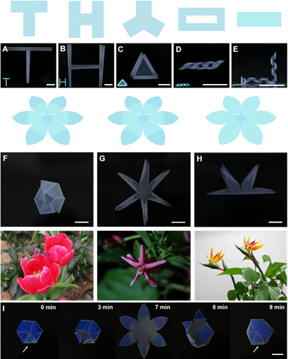 图3. (A-E)海藻酸钠水凝胶的多种复杂三维结构图(T形、H形、三通管状结构、双螺旋、串联三螺旋);(F-H)基于海藻酸钠水凝胶的多种仿生花形貌图;(I)仿生花在离子溶液中动态绽放闭合图