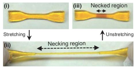 对水凝胶施加拉伸力(拉伸)会使其一些刚性和脆性聚合物链断裂。这导致在破碎的聚合物链的末端产生称为“mechanoradicals”的化学物质。这些机械装置可以触发从周围溶液吸收到水凝胶中的单体与聚合物网络的连接,从而强化材料。