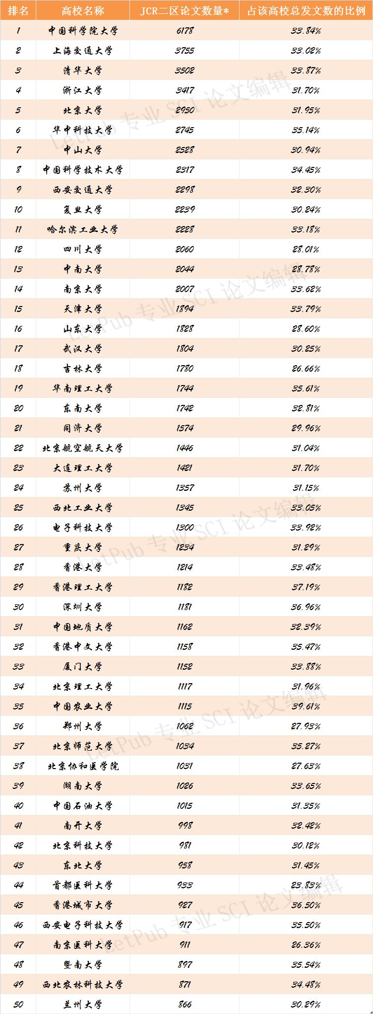 2018年中国高校发表JCR二区期刊论文数量排名【Top50】
