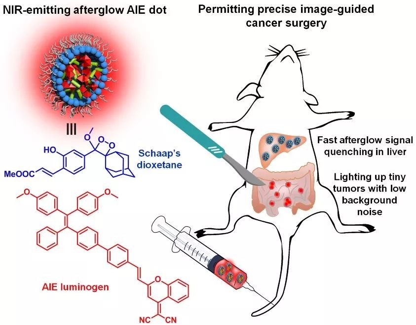 最近,南开大学丁丹教授课题组首次设计并合成了一种具有AIE性质的近红外长余辉发光纳米点(AGL AIE dots;图一)。