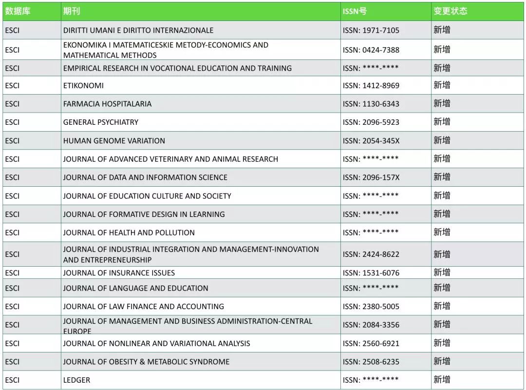 注:新增,晋级表示期刊从ESCI数据库进入SCIE/SSCI/AHCI数据库,以下同。