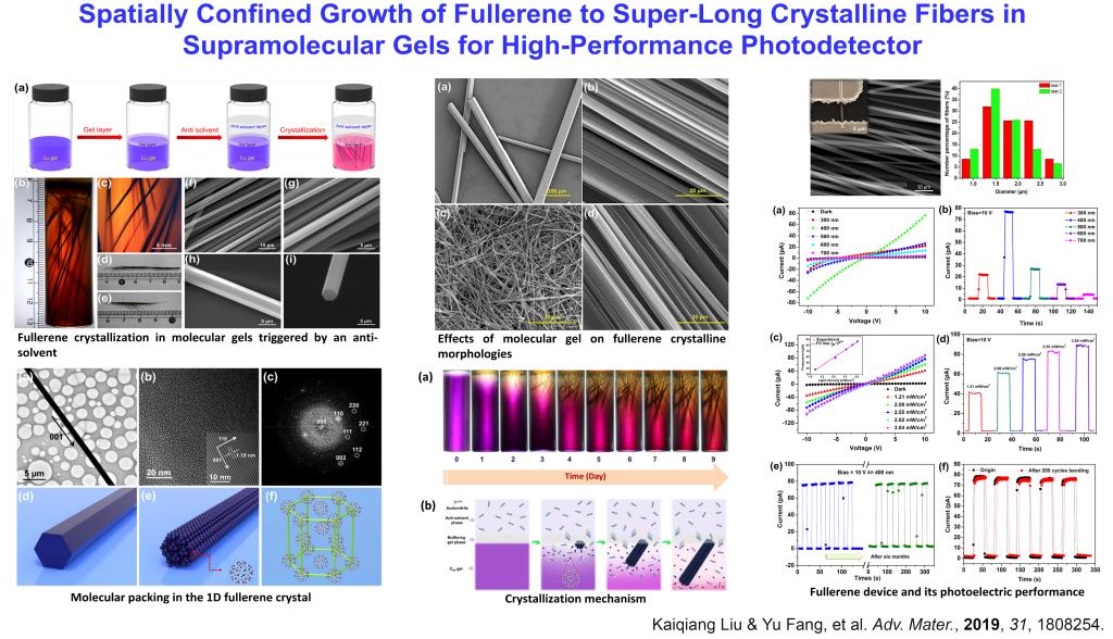 在晶体可控生长的基础上,课题组与华中科技大学翟天佑教授团队合作系统考察了富勒烯一维晶体的光电性能。研究结果表明富勒烯晶体表现出优异的光电性能与良好的稳定性(响应度:2595.6 mA W?1;探测率:2.7 × 1012Jones;开关比:540;量子效率:800%;稳定性:不低于6个月),进一步证实了凝胶结晶法在高质量晶体培养中的突出优势,为后续相关研究奠定了坚实基础。