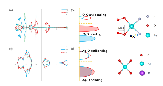 AgO2F(“异常”结构)与KAgO2(“正常”结构)的电子结构比较。AgO2F由于具有不寻常的氧化态(O22-)从而具有异常的表现