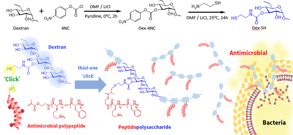 图1.DexL-g-K12.5F12.5-50%肽多糖的合成及抗菌作用。(来自Biomacromolecules)