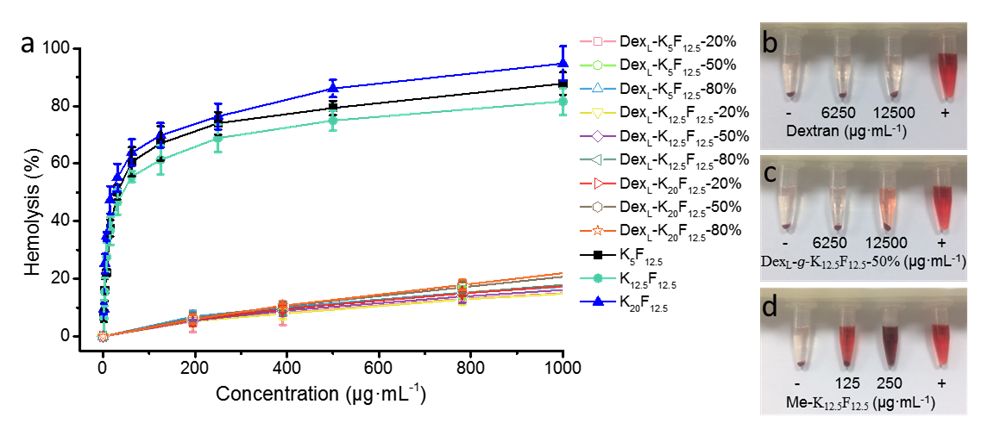 图2. 不同浓度下的溶血活性:(a)抗菌多肽及系列抗菌肽多糖,(b)葡聚糖,(c)抗菌肽多糖,(d)抗菌多肽。(来自Biomacromolecules)