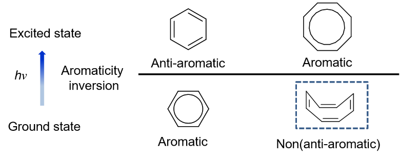 在激发态对分子的运动行为进行调控来构建先进的光功能材料是近年来的研究热点。香港科技大学唐本忠院士团队近年来在该领域做出了一系列代表性研究成果。近日,他们在前期激发态分子运动调控的相关工作基础之上(Nat. Commun. 2019, 10, 768.; Adv. Funct. Mater. 2018, 28, 1705609.; Chem. Sci. 2018, 9, 6118.; Angew. Chem. Int. Ed. 2018, 57, 7997.),提出从芳香性的角度来研究分子的激发态运动行为,进而提出通过芳香性翻转来设计振动受限类型聚集诱导发光体系的新策略(Fig. 1)。相关成果以 “Non-aromatic annulene-based aggregationinduced emission system via aromaticity reversal process”发表于Nat. Commun. 2019, 10, 2952.,并以博客形式在nature系列的化学社区进行了推送:https://chemistrycommunity.nature.com/users/264496-zheng-zhao/posts/50781-non-aromatic-annulene-based-aggregation-induced-emission-system-via-aromaticity-reversal-process
