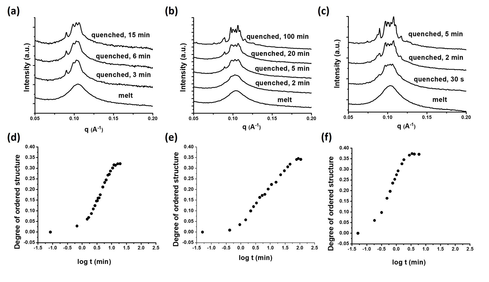 图二 基于SAXS的AB5型巨型分子相形成过程的动力学研究。样品由熔融无序状态下(150 °C)淬火到不同温度(a) 110 °C, (b) 118 °C, (c) 125 °C后在不同退火时间对样品结构的SAXS检测。样品由熔融无序状态下(150 °C)淬火到不同温度(d) 110 °C, (e) 118 °C, and (f) 125 °C后,样品结构有序度与退火时间的关系。