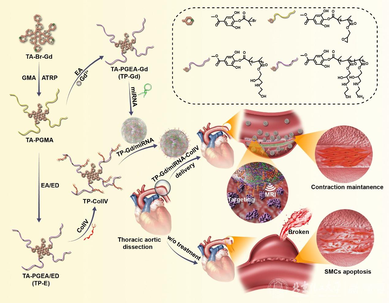 该篇论文报道了一种能够实现急性胸主动脉夹层(TAD)诊疗一体化的新型靶向核酸纳米递送系统(TP-Gd/miRNA-ColIV)。该纳米系统不仅可以通过携带miR-145有效的降低TAD的发生,还可以对TAD的治疗过程进行无损伤评估与监控。