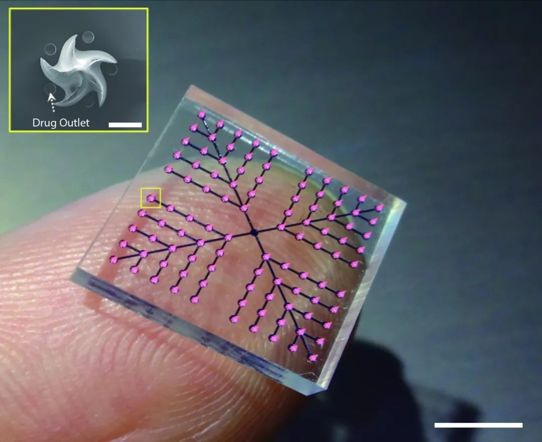 人体拇指上显示的微针贴片在对其表面施加轻微压力时递送液体药物。图片来源:参考资料[1]