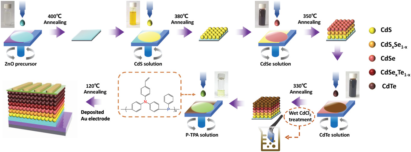 论文首次采用溶液法双界面修饰方法,将CdS/CdSe双电子传输层(ETL)和poly(diphenylsilane-co-4-vinyl-triphenylamine)(P-TPA)热交联聚合物空穴传输层(HTL),同时用于调节优化CdTe纳米晶太阳能电池电学/光学特性。与单ETL层CdS或单ETL层CdSe器件相比,双ETLs层CdS/CdSe器件有更优异的光伏性能,这主要归因于阴极界面处载流子复合和电子注入势垒的减小以及光收集效率的改善;与没有HTL层器件相比,P-TPA HTL器件有更优异的开路电压(Voc)和短路电流(Jsc),这主要归因于P-TPA的偶极子效应使得与CdTe能级更加匹配,有效减少了阳极界面复合,提高了载流子收集效率。通过阴极和阳极双界面优化,全溶液法纳米晶CdTe电池(ITO/ZnO/CdS/CdSe/CdTe/P-TPA/Au)效率(PCE)达到了9.2%,这是目前溶液法制备倒置结构CdTe 纳米晶太阳能电池的最高纪录。这项研究工作表明,采用无机或有机新型界面材料,同时用于阴极和阳极界面工程,是未来进一步提高CdTe纳米晶太阳能电池性能非常有效的一种策略和方法。