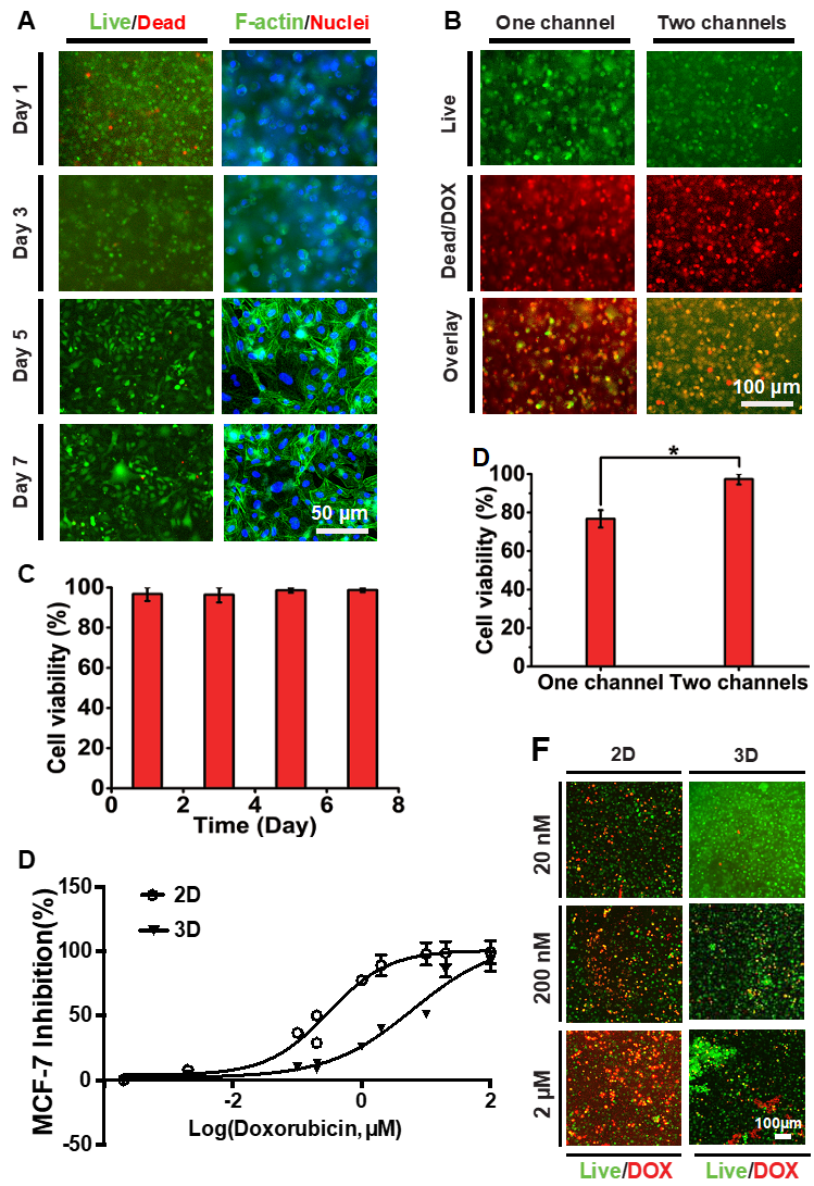 研究人员考察了芯片中细胞不同时间、单/双通道的存活情况,并比较doxorubicin作用MCF-7乳腺癌细胞二维培养与芯片中三维培养的不同作用效果。与单通道相比,含有淋巴回流的TOC-BBL中药物的扩散速度明显增加;与二维单层培养相比,TOC-BBL中抗肿瘤药物IC50大大提高,进一步证实了淋巴引流系统与癌症药物筛选的密切关系。TOC-BBL的应用为大多数抗肿瘤药物的筛选提供了更加接近体内的循环途径。
