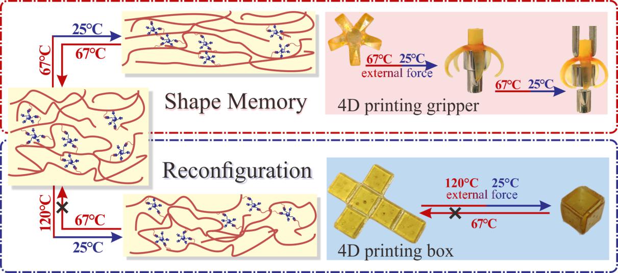 最近,中国科学院福建物质结构研究所、中科院功能纳米结构设计与组装重点实验室吴立新研究员团队在科技部国家重点研发计划重点专项和海西研究院“一三五”重点培育项目的支持下,首次报道具有永久形状可重构性的4D打印形状记忆聚合物,设计合成了一种带有醛基的新型甲基丙烯酸酯单体(4-甲酰基苯甲酸2-(甲基丙烯酰氧基)乙酯,MEFB)和超支化硅氧烷交联剂(HPASi),构建出具有动态亚胺键的(甲基)丙烯酸酯体系(IEMSis),用以实现4D打印。HPASi的柔性链结构显著提高了IEMSis的韧性,约为添加前的33-97倍。HPASi的交联作用也赋予IEMSis良好的形状记忆性能,它们的形状固定率和形状恢复率分别为97.5-97.6%和91.4-93.7%。同时,在没有催化剂和相对温和的条件下,IEMSis可以通过亚胺键的动态交换实现应力松弛,使得4D打印的永久形状在特定条件下还可以重构,因而可望扩展4D打印技术的应用范围。相关研究成果发表在ACS Applied Materials & Interfaces(2019, DOI:10.1021/acsami.9b14145)。博士后缪佳涛为该论文的第一作者。该研究采用林文雄团队研发的设备,成果已在海西研究院参股公司国锐中科应用。