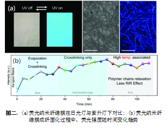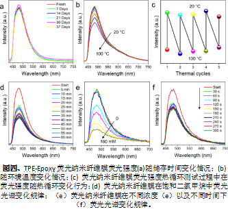 然后,将电纺得到的荧光纳米纤维膜加热固化使其交联稳定。这涉及纳米尺度溶剂蒸发和树脂化学交联,所以其固化较为复杂。研究尝试通过实时跟踪固化过程中荧光纳米纤维膜的荧光光谱变化来解释描述这一过程:初始由于高比表面和多孔形貌,固化初始溶剂快速挥发,同时环氧树脂与固化剂的交联反应,对AIEgen荧光分子的分子内运动束缚快速增强,表现出纤维膜的荧光强度快速上升;随着体系中溶剂挥逐步挥发完全,进一步的树脂的交联固化会加强束缚荧光分子,表现出荧光强度稳步上升;随着加热时间的延长,长期处于高温下,纳米纤维膜的聚合物发生链段松弛,对荧光分子的分子内束缚减弱,荧光强度降低。由于荧光光谱的实时性与灵敏性,为研究跟踪基于热固性聚合物的纳米纤维膜的静电纺丝制备过程提供了新的研究方法。