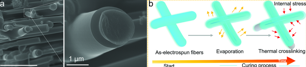 有趣的是,结合场发射扫描电子显微镜观察,单根纤维呈现独特的核/鞘形貌:通过静电纺丝制备纳米纤维后,由于高比表面积,溶剂的挥发与预聚物的反应,使得表面先发生固化;随着内部溶剂的挥发与固化反应的进一步进行,包裹在内部的预聚物,撑出表面壳层的包裹束缚,在端口挤出,使呈现核鞘的形状。