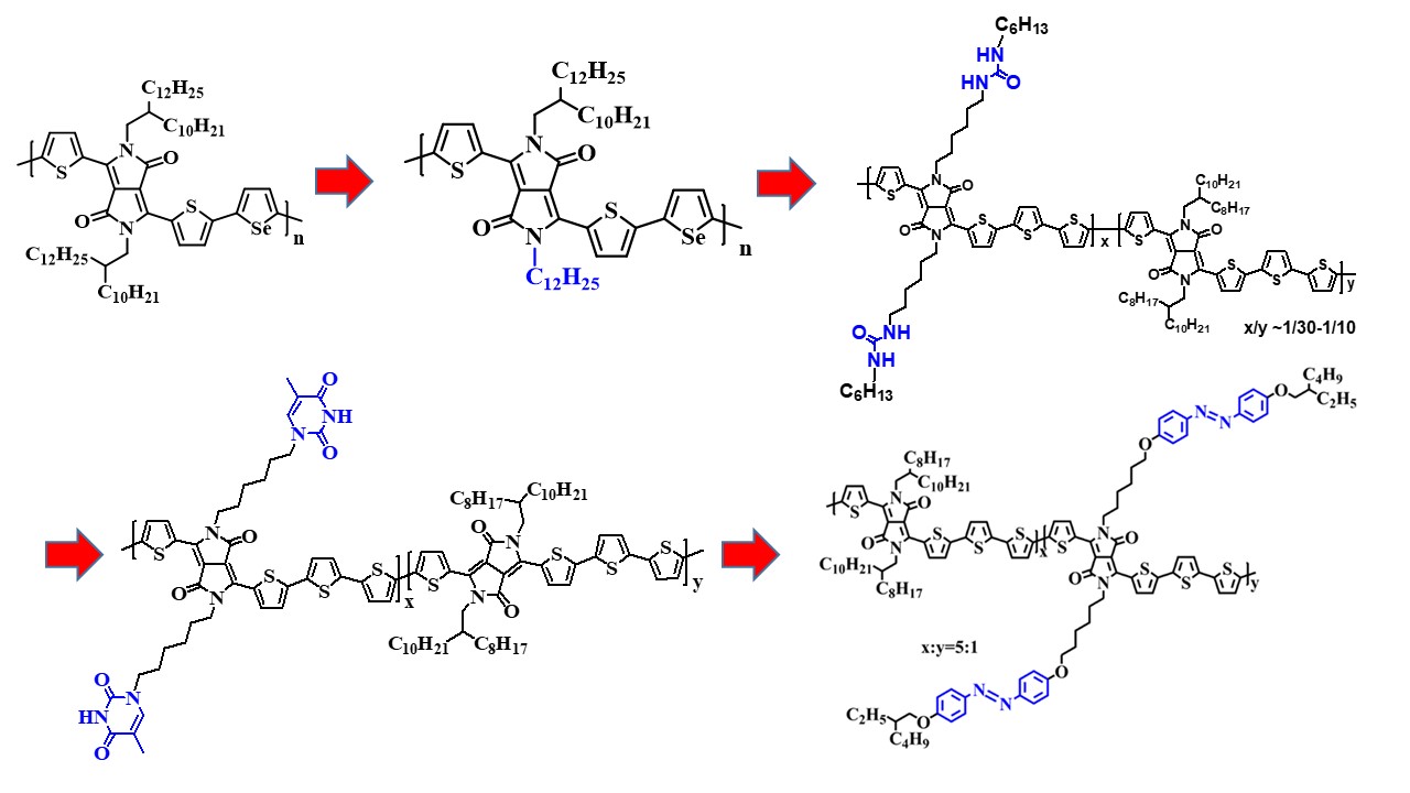 在中国科学院战略性先导科技专项B和国家自然科学基金委的支持下,中科院化学所有机固体院重点实验室张德清研究员课题组针对烷基侧链对共轭(高)分子聚集态结构、载流子传输性能的调控以及新功能构建等方面开展了深入研究,取得系列研究进展。他们通过改变基于DPP的共轭D-A高分子的烷基侧链结构,成功制备含“直链/支链”共轭高分子。在不改变共轭主链结构的情况下,“直链/支链”共轭高分子薄膜的迁移率显著提高,达到9.4cm2V-1s-1(Chem. Mater. 2018, 30, 3090)。他们曾通过向烷基侧链中引入脲基团,使聚集态薄膜的结晶性和有序性增强,载流子迁移率获得显著提高,达到13.1cm2V-1s-1(J. Am. Chem. Soc. 2016, 138, 173)。美国斯坦福大学鲍哲南教授、加拿大温莎大学和滑铁卢大学Simon Rondeau-Gagné和李玉宁教授运用该策略,向烷基侧链中引入脲、酰胺基团提高共轭高分子薄膜的迁移率和改变共轭高分子的力学性能。最近,他们设计合成了含有胸腺嘧啶基团的DPP共轭高分子。发现胸腺嘧啶基团的引入,不仅可以提高载流子的迁移率,而且利用胸腺嘧啶基团与金属离子的配位作用,成功构筑了兼具高灵敏度和高选择性的有机场效应晶体管CO传感器(Chem. Mater. 2019, 31, 1800)。除氢键基团外,他们也将其他功能基团也引入侧链,探索了有机场效应晶体管的新功能。例如,他们首次将偶氮苯基团引入聚合物的侧链,利用其所制备的光控双稳态晶体管器件具有可逆性和稳定性好、响应速度快、高迁移率等优势(Adv. Funct. Mater. 2019, 29, 1807176)。