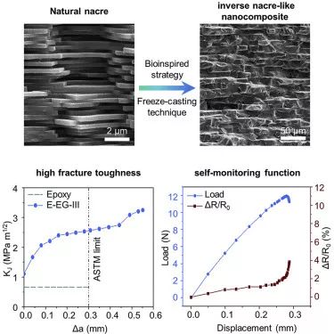 从上述问题可以看出,解决纳米填料在复合材料中的团聚问题,是提高断裂韧性的关键。此外,制备具有自我修复或者自我监测功能的复合材料,也是新型功能化材料的研究趋势。一直以来,大自然都是我们人类灵感的供应者。自然界物质结构千变万化,其中一个神奇的结构就是珍珠层结构。鲍鱼壳珍珠层的 “砖-泥”式结构使得其断裂韧性是无机霰石的3000倍(珍珠层由重量分数为96wt%的霰石碳酸钙和4wt%的生物大分子组成)。程群峰教授团队受此启发,构建了反鲍鱼壳结构石墨烯-环氧树脂纳米复合材料(材料中含有~99%的有机环氧树脂,故而称之为反鲍鱼壳结构石墨烯-环氧树脂纳米复合材料)。一方面使得材料的韧性提高到环氧树脂的3.6倍;另一方面利用材料自身的导电特性,实现了对结构裂纹的监测。
