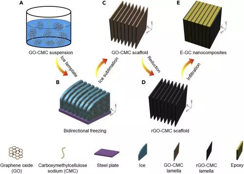 首先将氧化石墨烯(GO)和羧甲基纤维素(CMC)按照质量分数1:1的比例进行混合,得到均质悬浮液。第二步,利用双向冷冻技术获得层状冰晶,将悬浮液固定在冰晶之间。之后升华去掉冰晶获得氧化石墨烯-羧甲基纤维素(GO-CMC)支架结构。第三步将GO-CMC支架在200 °C下进行热处理,还原氧化石墨烯,获得具有导电性的还原氧化石墨烯-羧甲基纤维素(rGO-CMC)支架。最后,通过真空辅助技术,将液态环氧树脂前驱体渗填于rGO-CMC支架中,并在130 °C下保持2小时。作者使用扫描透射显微镜对所合成的纳米复合材料的形貌进行表征(图2)。图2A和图B分别是热处理前后复合纳米材料的结构,可以看出,该结构整体呈现一种交错堆叠的多孔三维结构,这些定向排列的孔洞可以用来填充环氧树脂。rGO-CMC支架包含众多桥连结构,能够保证其在渗填过程中的结构稳定性。图2C为渗填环氧树脂后的石墨烯-环氧树脂纳米复合材料(E-GC)的电镜图,可清晰看到材料的层状结构。