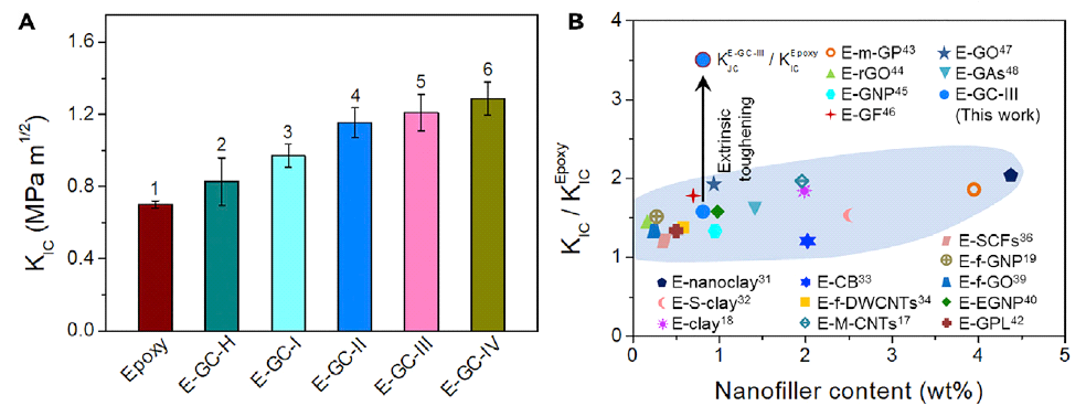 作者检测了环氧树脂、石墨烯-环氧树脂均匀共混纳米复合材料 (E-GC-H)、不同GO-CMC含量的反鲍鱼壳结构石墨烯-环氧树脂纳米复合材料(按照E-GC-Ⅰ/E-GC-Ⅱ/E-GC-Ⅲ含量依次升高)以及E-GC-Ⅳ(进一步还原E-GC-Ⅲ)的力学特征。从图3A中可以看出,环氧树脂的断裂韧性最差,并随着rGO-CMC含量的增加,材料的KIC(初始断裂韧性)值逐渐升高。其中rGO-CMC含量最高的E-GC-III ,以及还原程度最高的E-GC-IV,两者垂直于层级方向的KIC值分别是层级方向的~1.72和~1.83倍。同时,通过测量E-GC-III的阻力曲线发现,当裂纹出现并且开始扩展时,材料的最大断裂韧性(KJC)高达~2.53 MPa m1/2,显著高于以往同质增韧方案所获得的断裂韧性值(图3B)。