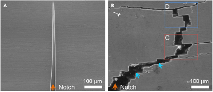 图4 A 环氧树脂材料中的裂纹;B: E-GC-III结构中的裂纹