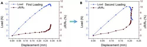 研究团队探究了材料所受荷载和导电性之间的变化关系。如图5所示,在第一轮荷载过程中(图5A),因裂纹还未扩展,材料电阻值随着荷载升高而缓慢增加;当微小裂纹开始扩展时,电阻值迅速增加。在第二轮荷载过程中(图5B),由于裂纹已经发生一定程度的扩展,初始阶段电阻值的增加相比第一轮较为迅速;随着裂纹的进一步扩展,材料电阻值急剧上升。这个现象表明,对材料电阻值的监测能够帮助人们发现材料中裂纹的产生和变化。